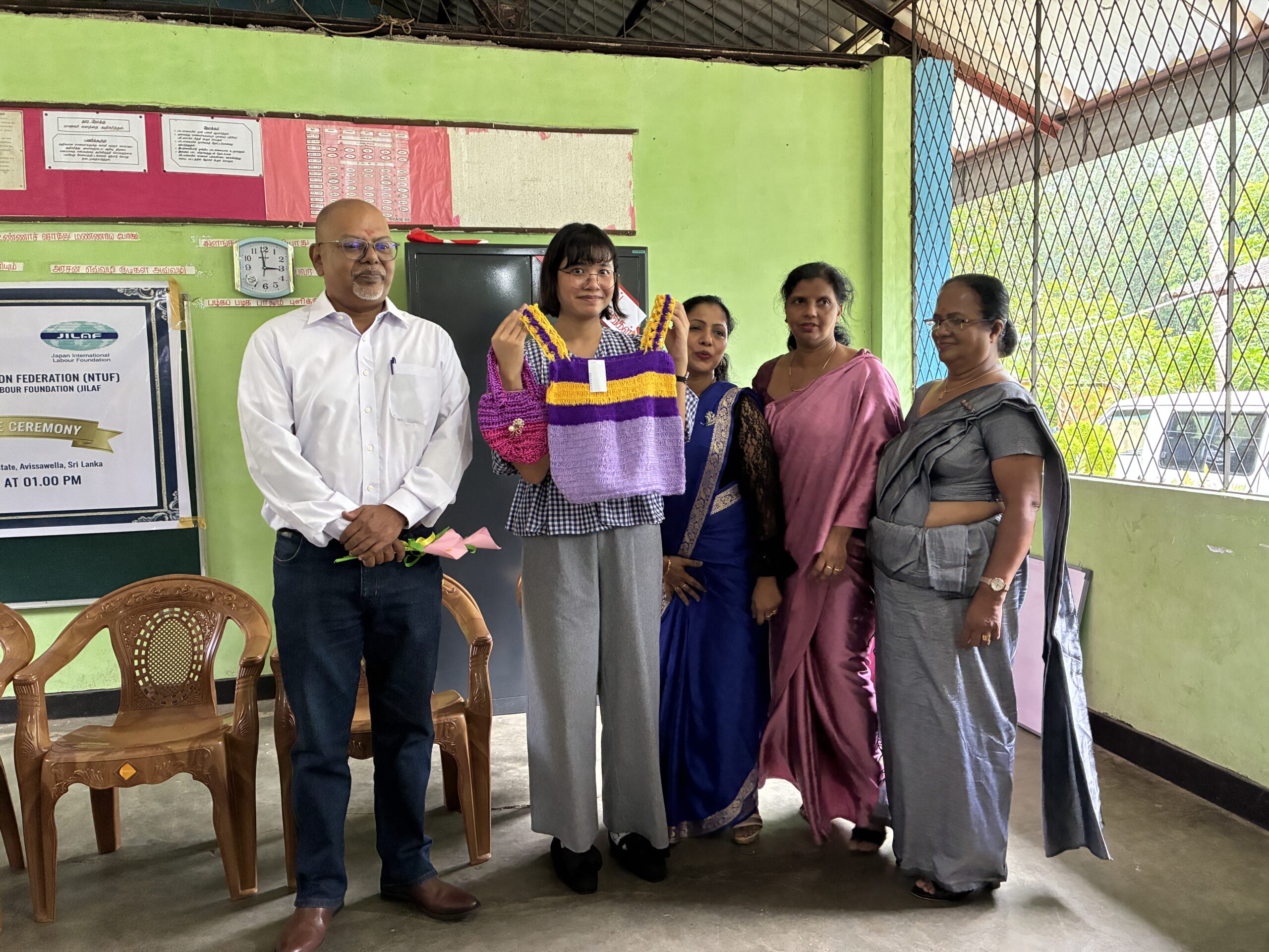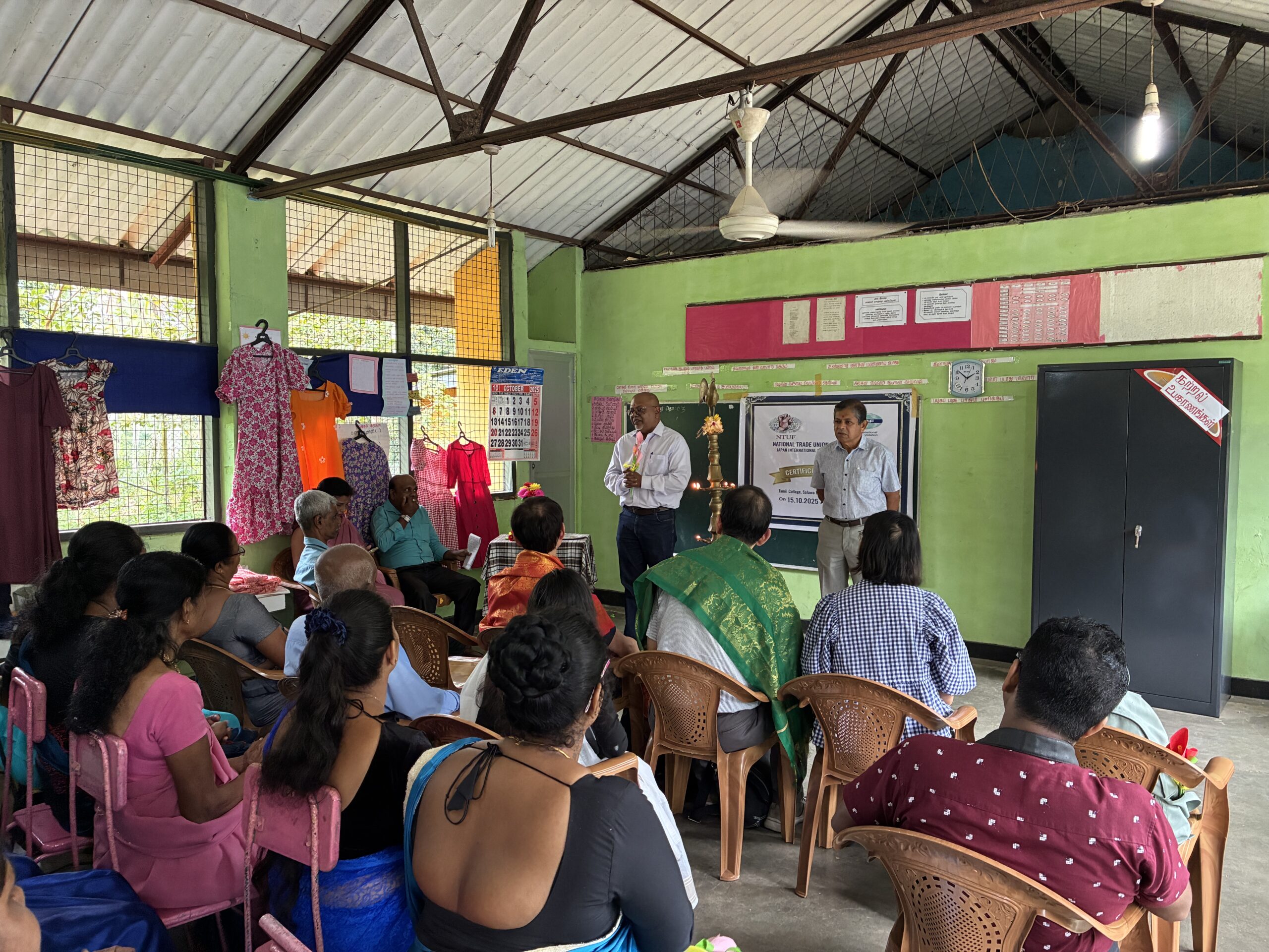 スリランカ・アヴィサウェラにおいて、縫製分野の職業訓練修了式を開催しました。本研修は、スリランカ全国労働組合連盟(NTUF)が運営し、16名の受講生が約6か月間にわたり、縫製に関する職業訓練を受講しました。