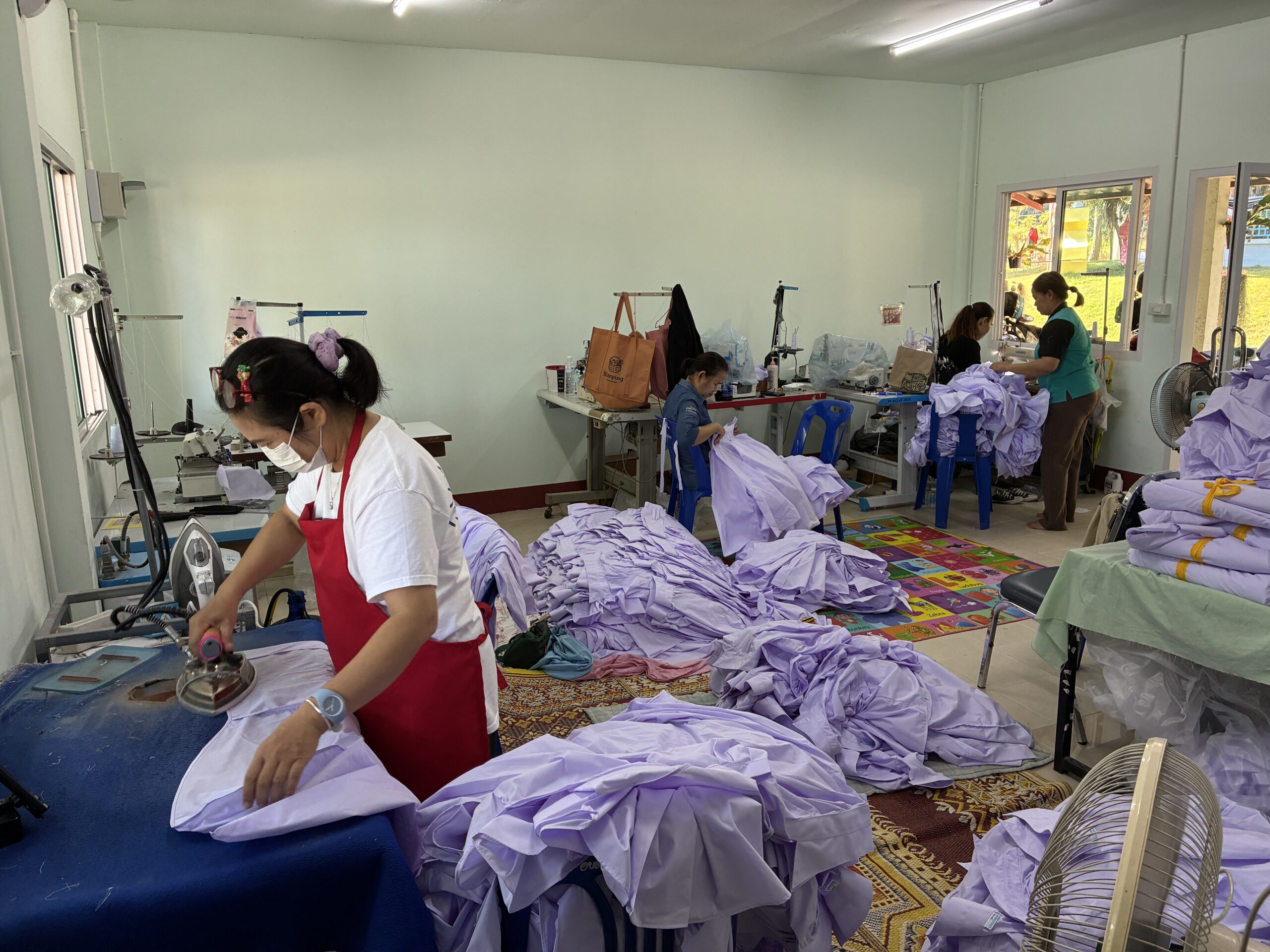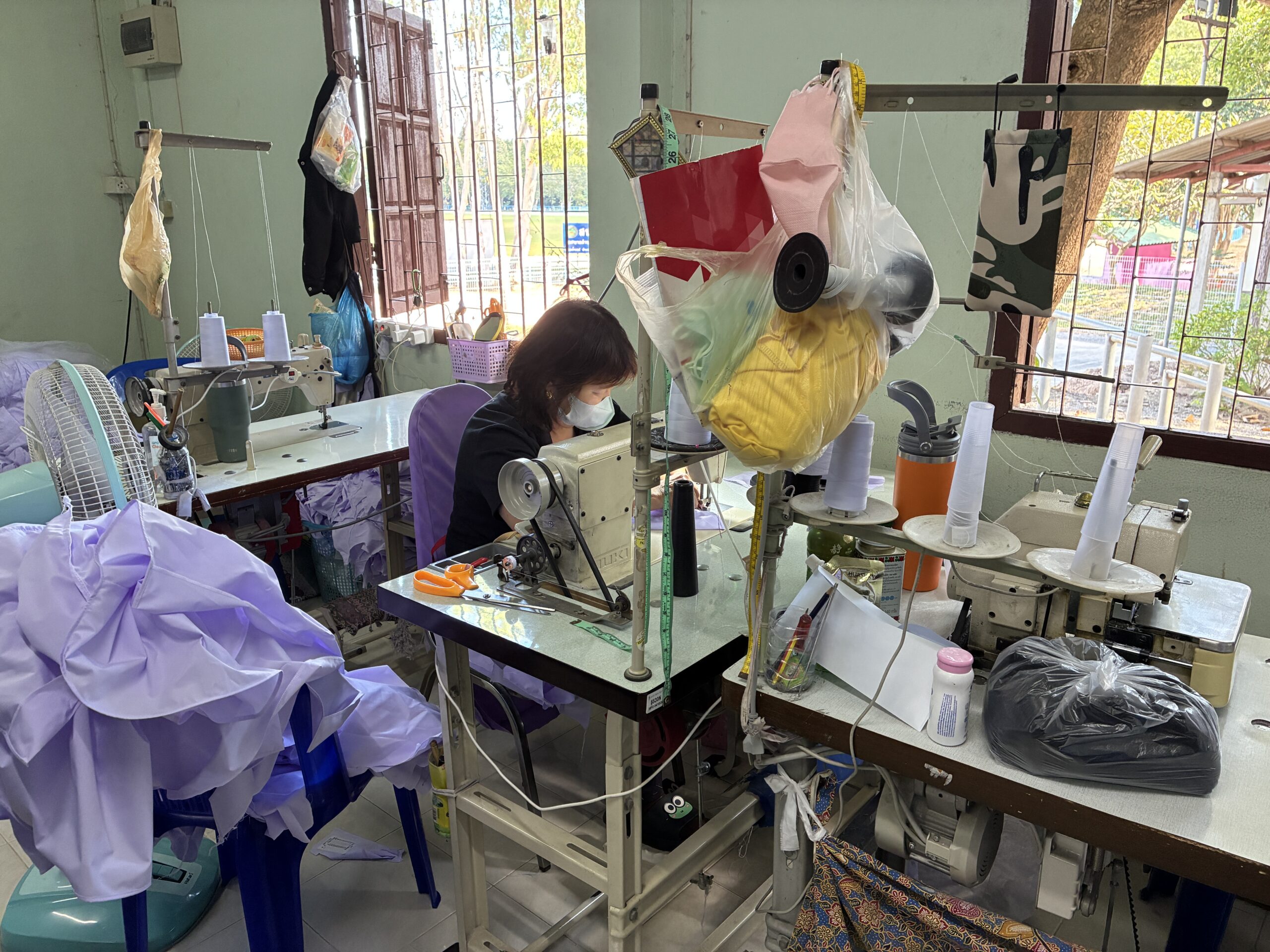 午後には、縫製の職業訓練グループを訪問しました。同グループは現在、学生制服用のワイシャツを製作しており、新型コロナウイルス感染症拡大時には需要が落ち込んだものの、現在は回復傾向にあるとの報告を受けました。しかしながら、取引先企業との間で正式な契約書を締結していないまま製品を買い取ってもらっている状況であり、将来的な取引継続の保証がないことが課題となっています。