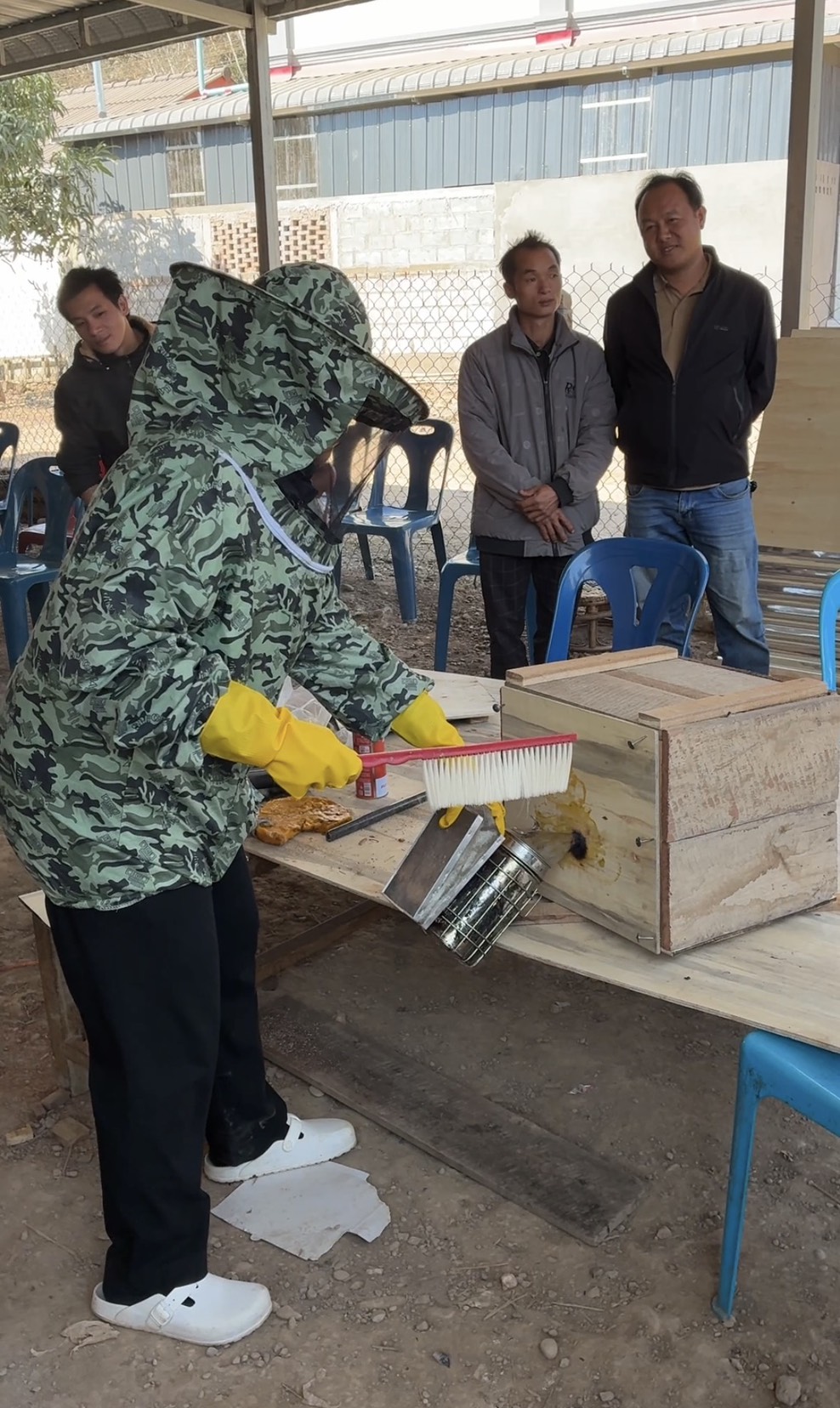 ラオスでは東洋ミツバチによる養蜂が主流であり、特に5月の最盛期には高い付加価値での販売が見込まれています。今回は女王蜂を捕獲するための箱の製作までを実施しました。